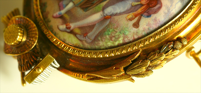 エナメル細密画は庭師をモチーフにしたもので、かなり細かくてレベルの高い細密画。細密画の素晴らしさもさることながらフレームもまた素晴らしい、庭に咲く花などの植物、庭仕事に使う道具や麦わら帽子を表現した金細工はかなり珍しいものと言える。全体の作りも申し分なく、特に、取り外しの出来るバチカンのネジの作りの正確さが本当に凄くてぴったりしっかりはまる。 |