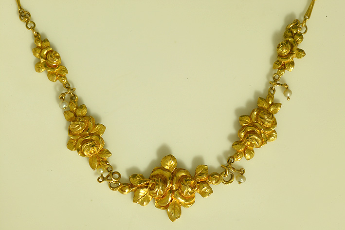 | 18k 天然真珠 フランス 1890〜1900年頃 長さ46cm モチーフ部分14cm センターの大きいモチーフ3cm×2cm Sold フレンチヌーボーらしいグッドデザイン、見事な彫金、そして手にもつとずりと心地よい重みを感じるのは一級品の証!♪ 裏にも彫金が施されています。しかもパーフェクトコンディション♪そしてこの価格!パリのトレジャーハンターは凄腕です(笑)。 |