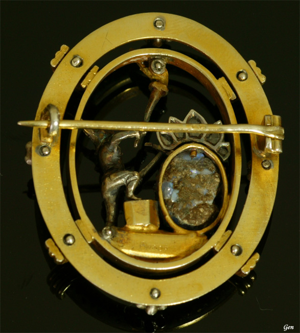 「こびとの鉱山」 ローズカットダイヤモンド ルビー エメラルド ボルダーオパー ル シルバー シルバーギルト オーストリア 1880年頃 ペルシャ王室の仕事した作家 Ludwig Politzer作 4.2cm×3.5cm Sold ペルシャ風のエキゾチックなエナメルのフレームにこびとがボルダーオパールを採掘しているファンタジックなデザイン!♪ローズカットダイヤモンドは火花を表しているのです。 |