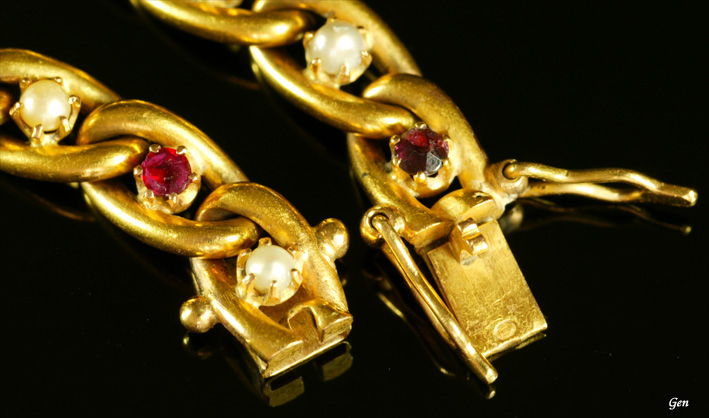 ルビー&パール ブレスレット ルビー パール 18k フランス 1900年頃 19.5cm×0.7cm Sold 小さくても上質の天然真珠が如何に貴重な物だったかが解る、とても丁寧な留め方です。 もちろんルビーも上質な石が使われています。 |