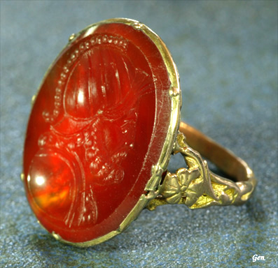 インタリオ リング 斑のある上質のコーネリアンのインタリオに軍神マルスの精悍な顔を巧みな彫りで表現しています。ヘルメット上部の飾りを小さな連続する円で表現していますが、乱れの無い完璧な彫りですし、同じくヘルメットの筋は立体感を出す為の曲線にしてあるところなどは見事です! コーネリアンは限界まで薄くカットされていますが、それは下の金の色を反映させて石を美しく見せる為で、これはインタリオを彫る時に細心の注意を払う必要があるとても難しい仕事なのです! |