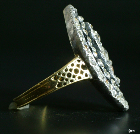 | マーキーズシェイプ オープンワークダイヤモンドリング ローズカットダイヤモンド シルバー&ゴールド ベゼル2,6cm×1,6cm(大型) サイズ 16(変更可能) フランス 19世紀初期 Sold ベゼルはエナメルではなく透かしになっている極めて珍しいデザイン! ローズカットダイヤモンドとしては、とてもクリーンで輝きの強い上質の石です! 小さなローズカットダイヤモンドの使い方が素晴らしい!♪ この拡大画像では全く分からないと思いますが、極小のローズカットダイヤモンドで形もいろいろな石をまるでモザイクのようにセットしてあるのが凄いですね〜!♪ こういうやり方は古い年代特有のものですが、この指輪は僕も見たことの無い非常に面白い作りとデザインです! シャンクにも透かしが入ったデザインが見事です! 大型の指輪なので、ちょっと長い指の方向きですが、古い年代のこれだけ特徴のある指輪として価格も大変お安いな価格になる予定です!♪ |