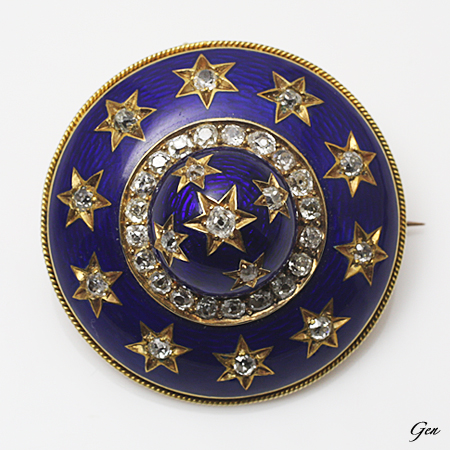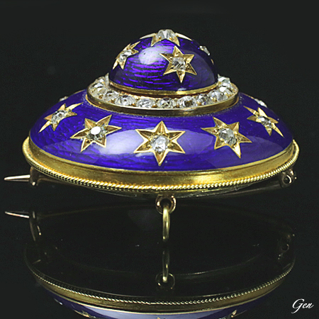 | ブルーエナメル UFO? ブローチ イギリス 1860年頃 オールドヨーロピアンカット・ダイヤモンド、ギロッシュ・エナメル、18ct ゴールド ロケット付き 直径3,8cm 厚み1,6cm SOLD |