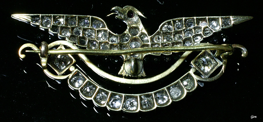 フェニックス(不死鳥) ブローチ オールドヨーロピアンカット・ダイヤモンド ローズカットダイヤモンド ルビー シルバー&ゴールド 45mm×20mm イギリス 1870年頃 Sold