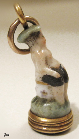 ポーセレン、ブラッドストーン、 18K イニシャルDが彫られている 高さ2,2cm シールの直径1cm オランダ? 19世紀後期 Sold ポーセレンのシール自体がとても珍しいですが、何と可愛いシールでしょう(笑)♪♪♪この子はいったい何に腰掛けているんでしょう?