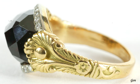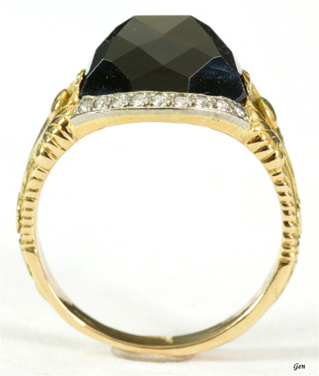 アールデコ ガーネット リング ガーネット、オールドヨーロピアンカット・ダイヤモンド ゴールド(18k)&プラチナ ベゼルのタテ1,2cm ガーネットの大きさ 0,9cm×1cm×0,4cm サイズ 11,5(変更可能) Sold 僕はこの仕事を始めて33年になりますが、これほど面白いカットの石の指輪を見たことがありません!! しかも透明感のある美しいガーネットでこれだけ厚みがあるのにこれだけ素晴らしいコンディションですからね〜。 石の底部は変形の八角形ですが、石を留めている上下の縁は緩やかな曲線で、上部だけがプラチナで下部はゴールドです。 これはエドワーディアンのようにコストダウンの目的はなく、色彩を意識したものなのです。 ゴールドのシャンクのデザインも極めて個性の強い石のカットを活かすために、植物模様でこれも見たことのない個性溢れるデザインです! このような特別のカットの石を使った指輪をデザインするということは、独創的なデザインと高度な技術が要求されますし、作ってみないと解らないことが多いので、おそらく何度も何度もやり直しては考えて問題を解決するという作業をやっていると思います。 だからこの指輪のような特別にオーダーされた指輪は、当時は相当に高額な指輪だったと思います!! 石だけ珍しいカットでも、その留め方やベゼルとシャンクのデザインが平凡では魅力は半減してしまいますからね。 この指輪のゴールドのシャンクはガーネットを左右から留める爪の役目をも果たしているのですが、これは正に独創的な留め方です!! このシャンクのデザインは、古代エトルリアの回転式の指輪にヒントを得たものかも知れないなと思っています。 何故ならシャンクの根本にある半球状のボールは、回転式指輪の特徴だからです。 こうしてこの指輪についての文章を書いていると、ますますこの指輪に惚れてしまいます(笑) アールデコは現代的なデザインの幕開けの時期ですが、斬新なカットのガーネットと古代のゴールド・リングの様式のコラボレーションは、本当に見る者を圧倒するパワーがあります!! この指輪を作った職人とはいったいどんな人物だったんだろうと想像したくなりますし、彼が作った他のジュエリーを見たくなりますね・・・。