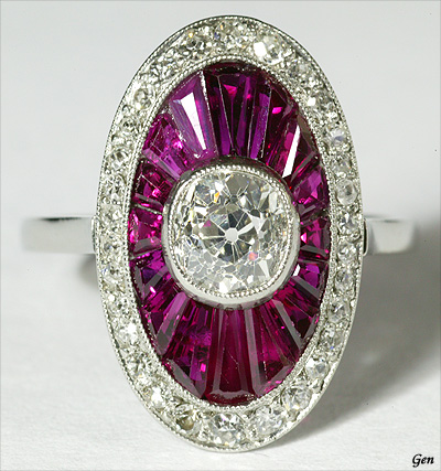 | カリブレカット・ルビー&ダイヤモンド リング オールドヨーロピアンカット・ダイヤモンド、プラチナ ベゼル1,9cm×1,2cm センターストーン約0,6ct サイズ10,5号(変更可能) フランス 1920年頃 Sold これはバックライトも当てて撮った画像ですが、普通のカリブレカットとは違い、一つ一つの石に面を取ってあるので、色も変化しますし輝きが実に美しいのです!♪ カリブレカットは爪を使わずに石の上下をレール状の物で留める難しい技術です。 普通は小さな石を使いますが、これは長さのある大きな石を使っています。これほど大きな石をカリブレカットで留めてある指輪を僕は今まで見たことがありません!! カリブレカットは直線状に石を留めるのも難しい技術なのに、楕円形のレール状に隙間無く留めるということは、一つ一つの石を隙間が出ないようにカットする必要があるのですが、これだけ長さのある石を完璧にカットするのは、普通では考えられないことなのです!! しかも一つ一つの石の縁をこれだけ大きくカットしてあるのだから想像を絶する至難の技なのです!! これだけ大きく拡大しても石と石の間に全く隙間が見えないのは正に驚異の仕事です!! この指輪のルビーはバックライトを当てなくても、特別なカリブレカットならではの色と輝きの変化があるので、指に填めた時に普通の指輪にない魅力が感じられるのです! もちろんセンターのオールドヨーロピアンカット・ダイヤモンドも上質の石で、ルビーの美しい色彩とダイヤモンドのシンチレーション(光の動き)がコラボレーションは、まるで夢の世界の美しい指輪と表現したくなるほどです! ベゼル裏の透かしもこの指輪に相応しい素晴らしい仕事ですし、石の裏の作りも特別な物です。 この指輪のような独創性のある細工の物は、一つだけ特別に作られた物だけに何度も失敗しながら苦労して作った筈です!だからもし、今この指輪を作ったとしたら莫大な価格になっている筈なのです! だからこういう特別の作りの指輪ほど安い物は無いのです!!♪ |