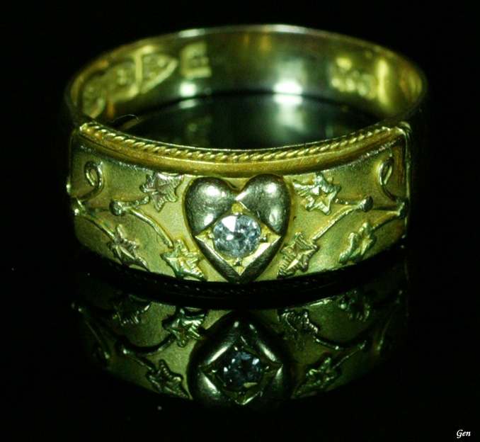 この指輪はベゼルが大きく開くロケットが付いていて、蓋を開くとALFLEDと彫金された文字が蝋付けされています。 シャンクの部分は磨いてありますが、ロケットの蓋の部分は艶消しで永遠を意味する蔦を彫り、中央には厚みのあるハートにはダイヤモンドをセットしてあります。 |