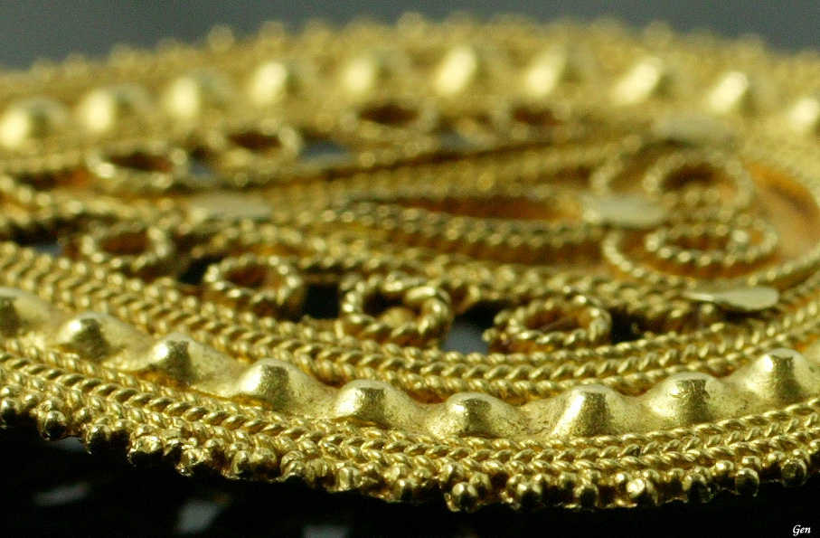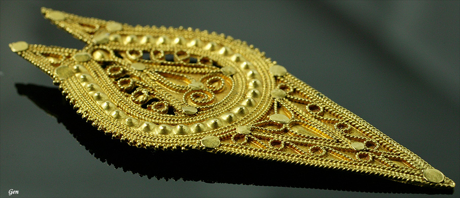 「ムガールの輝き」 22K〜24K ムガール帝国 18世紀 6,5cm×2,5cm (チェーンは付いておりません) Sold ムガール帝国のジュエリーは何点か扱っていますが、これほど古い年代の物は初めてです。カンティーユの原点のような仕事から18世紀後期ぐらいかなと思ったのですが、まるで古代のゴールド・ジュエリーのような見事な縒り線とグラニュレーション(粒金)それに打ち出しの技術を駆使した素晴らしい仕事を見ていると、ムガール帝国の全盛期、あの美しいタージ・マハルが作られた頃(1652年)に作られた可能性も充分にあると思います。 裏の金具を見るとどうもターバンに付けた飾りかも知れないなと思っています。以前にジョルジュ・ドンが舞台で使いたいからと、ムガール・ジュエリーのターバン飾りを買ってくれたのを思い出します。 このターバン飾りは、純度の高い金ならではの魅力的な色と輝きがありますし、古い年代の極めてグレードの高い金細工であることを考えると、この価格は破格にお安いと思います!!これがもしヨーロッパの同じ年代のゴールド・ジュエリーなら軽くこの2倍はしていると思います! インドのジュエリーは時代が下がると出来の良い物と雑な作りの物とにはっきり別れますが、これは本当に見事な細工です! 拡大画像を見て頂きながら見所をお話致しましょう。