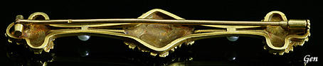 | アールヌーボー バー・ブローチ フランス 1890〜1900年頃 18K、天然真珠 長さ7cm Sold バー・ブローチはとても使いやすいブローチですが、長ければ長いほどスタリッシュで見栄えがするものです。 このバー・ブローチは長さ7cmと充分な長さがありますし、三本の美しいライン上に立体的な花びらをあしらったデザインは秀逸です!♪ デザインのアクセントとして二つの天然真珠が留められていますが、これらの真珠は扁平な真珠を選んでいます。 こういうところにも作者のセンスの良さが出ています。 |