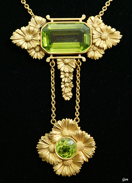 アールヌーボー ペリドット ネックレス フランス 1890〜1900年頃 ペリドット、18K モチーフ部分の長さ4,8cm×2,6cm 大きなペリドット0.9cm×1.4cm 小さなペリドット直径0.7cm 重量10.4g Sold 良い物は良い!♪(笑)でもほんと見惚れちゃいますね・・・。 このマット・ゴールドは希に見る美しい物です!♪見事な彫金のマーガレットにとても上質のペリドットがセットされた ネックレスは、見る者の心を捕らえて放しません!! |