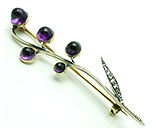 | アールヌーボー カボッション・アメジスト ブローチ ローズカットダイヤモンド、ゴールド&シルバー 1,5cm×5,5cm オーストリアorロシア 1890〜1900年頃 Sold 山菜のゼンマイのようなユニークなデザインは、 フレンチヌーボーとはひと味違い、何故か和んで来ます♪ このようなフィーリングのデザインのジュエリー はロシアとオーストリアの特徴です。 カボッションカット・ブローチの一番大きな石の形は高さのある独特の形で、ロシアのジュエリーに多い形です。 茎の根本に半球状のグラデーションがありますが、これはすべて彫り出してあるのです!! こういう手間のかけ方もロシアのジュエリーに多いのです。 カボッションカット・アメジストはあのサイベリアン・アメジストを思わせるような実に美しいアメジストです!♪ |
