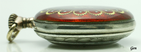 | 左はエナメルの中央にある装飾ですが、赤い地模様の上に浮かんでいるように見えるし、どう見ても立体的な作りに見えるでしょ! でも指で触れてみると完璧にフラットなのです!! これは不思議なんですよ! レッドエナメルの上に金のとても薄板を加工した物を置き、その上に透明なエナメルを施しているんだろうなと思っていますが・・。 上の画像でもよく見ると、ゴールドの模様も立体的な作りなのが分かります。 実際に肉眼で見ていると、金の模様が浮かび上がって見えるので、はっとする美しさがあるのです!! 僕はこのタイプのギロッシュエナメルはもっと評価されるべきだと思っています! まだ、他のエナメルに比べて安いなと思いますね。 |