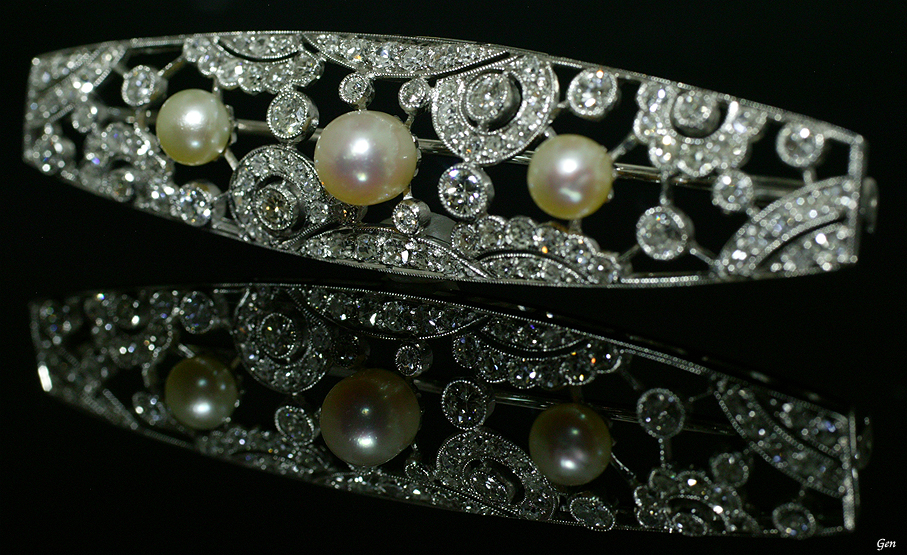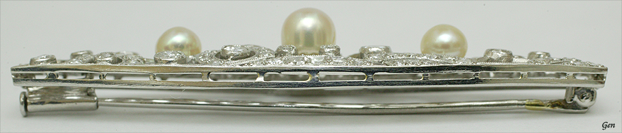 真珠の台座はデザインされた奇麗な物ですし、ダイヤモンドの裏の窓の仕上げは、このブローチに相応しい完璧なものです。 |