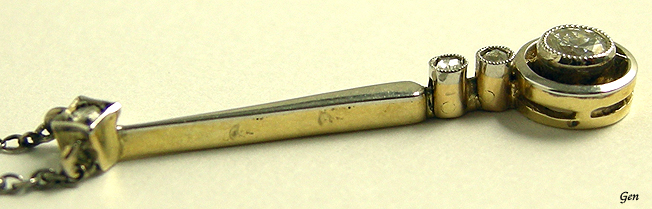 ほんの僅か曲線になっている菱形の部分から、ダイヤが着いている部分までのシャープなラインが実に美しい!♪ チェーンの駒より細い線から段々と太くしてありますが、最も細い部分でも板状(ナイフエッジ)になっているので、100年以上もの使用に耐える耐久力があるのです!! このような作りは現代の物だったら10年も経たない内に壊れているでしょう。 アンティークジュエリーはワックスを使った鋳造ではなく、金属を鍛えて作るハンドメイドだから、繊細でシャープな作りでも100年以上もの耐久力があるのです!! |