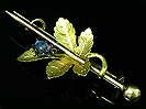 | ブローチ 『テントウ虫のサンバ♪』 フランス 1890年頃 ムーンストーン、ルビー、18K 1.6cm×4.7cm 3.8g Sold 植物の葉にピンを刺したデザインは、フランスのこの時代に人気があったデザインのようです。 何か意味があるのでしょうが、今のところ分かっておりません。 カタログにあるこのブローチもそうですね。 |