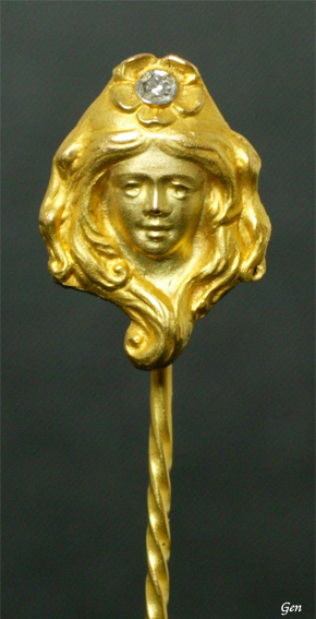 アールヌーボー ピン フランス 1900年〜1910年頃 18k プラチナ ダイヤモンド 1.8g モチーフ1.6cm 長さ6.6cm 女性の頭部にダイヤモンドがセットされた可愛いピン!♪ しかも値段も可愛い!!♪ ピンキャッチは別売りで18Kで¥3,000-です。