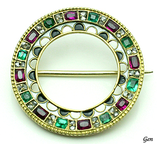 | ブラック&ホワイト・エナメル ブローチ イギリス 1880年頃 ルビー、エメラルド、ローズカットダイヤモンド ブラック&ホワイト・エナメル、18K 直径2,7cm 重量5,3g 円形の縁の外側はルビー、ダイヤモンド、エメラルドを交互にセットしてありますが、実物は実に美しい色彩です!! その内側のホワイトエナメルに半円形の窓とブラックエナメルは、カラフルな外側のラインとは対照的なモノトーンのラインなので、そのコラボレーションが、このブローチの魅力に大いに役立っているのです! 白バックの画像と黒バックの画像ではイメージが違って見えるのにご注目!! 黒バックでは窓の部分が黒く見えるので、まるでブラックエナメルの模様が連続しているように見えていいるのです! 美しい色彩の色石とブラック&ホワイトエナメルを効果的に使ったとても珍しいブローチで、服に付けた時の効果は抜群だと思います!♪ 裏の作りも非常にしっかりした丁寧な作りで、このブローチがハイクラスのジュエリーとして作られたことを示しています。 一番外側のゴールドの縁にはまるで粒金のような素晴らしい彫金が施されていますが、これも19世紀のアンティークジュエリーならではの高度な技術と大変な手間が掛かる細工なのです!♪ このブローチはレイトヴィクトリアンらしい、程良く洗練されたデザインで、とても珍しいブローチです!!♪ |