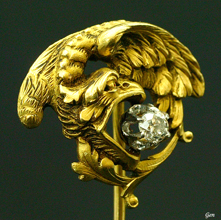 アールヌーヴォー キメラ クラバットピン フランス 1900年〜1910年頃 オールドヨーロピアンカット・ダイヤモンド、18K、プラチナ 全長6.9cm モチーフ1.9cm 1.9cm 重量5,8g キメラとグリフィンは、アールヌーヴォーのゴールド・ジュエリーのモチーフとしてはとても人気があったので、いろいろなデザインの物が作られていますが、このキメラのクラバットピンは今までキメラの中では抜群の出来だと思います!♪ 顎が外れんばかりの大きく開けた口に奇麗な輝きをダイヤモンドを加え、頭部が極端に大きくてアンバランスな造形はユーモラスを感じる面白いものです! 頭部や羽の彫金もハイレベルですし、裏にまで模様が彫られているのも良いですね。 ダイヤモンドを留めている爪がプラチナなのも、ハイクラスのジュエリーとして作られた証です。 以前に扱ったキメラのピンもご覧下さい。キメラの参考画像もあります。