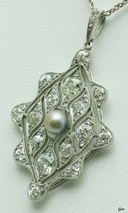 | 美しい斑のある真珠と贅沢なダイヤモンドの使い方、それに繊細精緻なミル! このような曲線の透かしを糸鋸で挽いて作るのが如何に大変なことか! だからこういうデザインのジュエリーは滅多に見る物ではないのです!!ロシアのジュエリーならではの細工なのです!! |