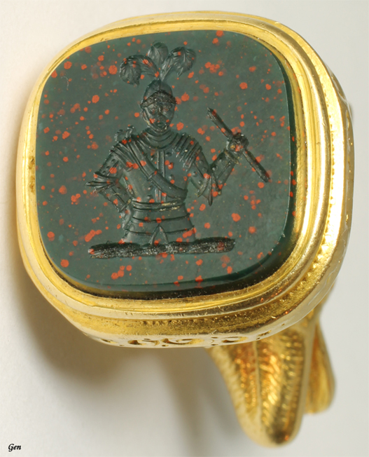 上質のブラッドストーンに彫られた騎士のインタリオは見事な彫りです!! |