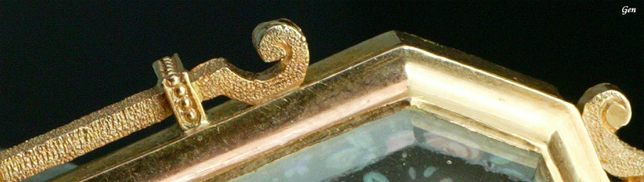 八角形のフレームは立体感のある見事な作りで磨きだしていますが、上下左右の装飾はタガネで非常に細かな模様を打った艶消し加工がしてあります。 一部に粒金のような装飾がありますが、これは金の板から彫りだしてあるのです!これは実際の大きさを考えると信じられない程の細密が彫金なのです!! |