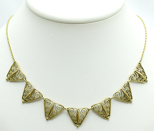 フランス 1900年頃 18K チェーン42,5cm 重量11,3g セミハンドメイド ゴールドチェーン Sold パリのエスプリを感じさせるフランスならではのゴールド ネックレスです!♪ 7個のパーツはすべてハンドメイドならではの手間を掛けた良い仕事で作られています。 その左右に金の板を渦巻き状にして縁にギザギザを入れた物を三個づつ蝋付けしてあります。 完璧に磨かれたボート型のパーツとギザギザの渦巻き状のコントラストが、美しい透かしの美を感じさせているのです! ゴールドだけで石もエナメルも一切使っていないシンプルな美は現代のどんな服にもマッチするので、とても使いやすいゴールドネックレスなのです!♪ |