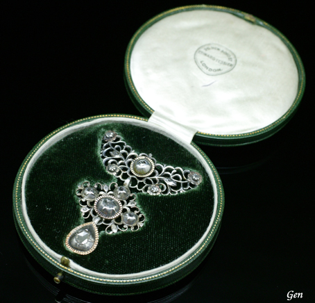 《透かしの美》 このタイプのジュエリーは、ポルトガルでも作られていますが、このフランス・ノルマンディー地方のジュエリーが原点なのです! まだダイヤモンドが極端に少なかった時代だけに、小さなローズカットダイヤモンドを如何にも大切そうに高く持ち上げた台に留めてあるのが印象的です。 このジュエリーの場合は、ダイヤモンドは付録のような物で、むしろ主役は「透かしの美」を感じさせる見事なオープンワークなのです! この透かしはエドワーディアンやデコのジュエリーの透かしのように糸鋸で挽いた物ではなく、相当な数のパーツを別々に作り、一つ一つ丹念に蝋付けしたものです! 高度な蝋付けの技術と完璧な仕上げの美しい透かしは、軽やかな美を好む日本人の琴線をくすぐるものがありますね。 |