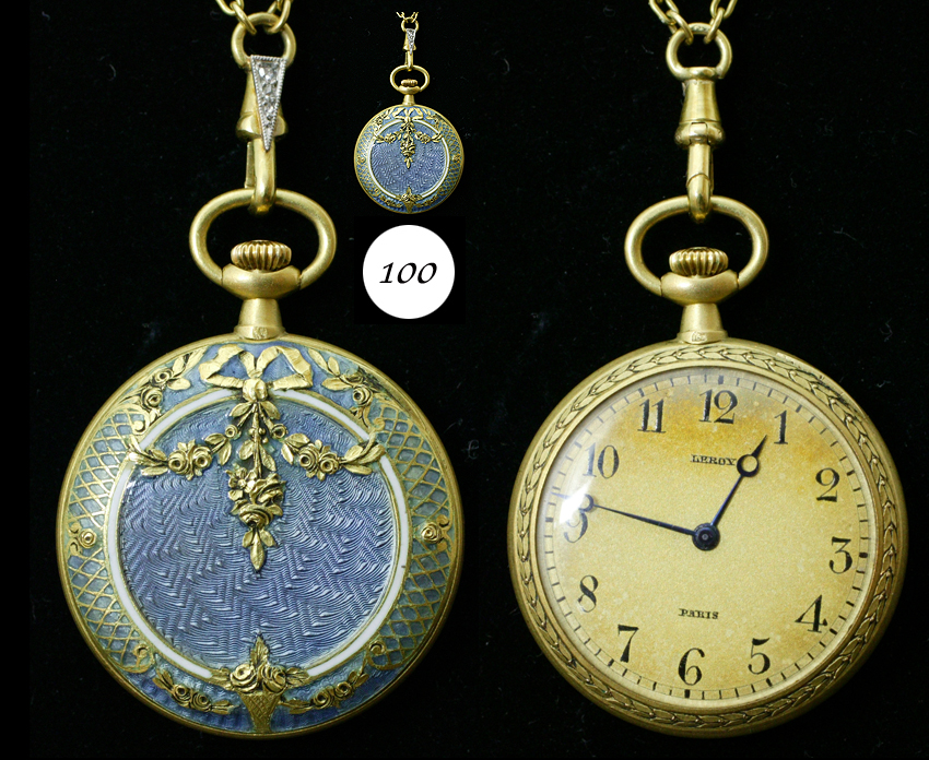 | 実に美しいブルーのギロッシュエナメルですが、このエンジンターンの模様は非常に珍しいパターンです!! バラとリボンのモチーフの彫金はハイレベルで、光の当たり方で変化する美しいギロッシュエナメルのコラボレーションは、実物をご覧になればきっと感動されると思います!!♪ バチカンの一部だけにプラチナを使っていることから、プラチナを一般的に使い始める前の時代だと思われます。 このペンダントウォッチは、素晴らしい金細工が主役で、それを引き立てるエナメルの名脇役というクラシックなコラボレーションが魅力です!♪ 文字盤は金で針もすべてオリジナルです。エナメルの面の右上に僅かな欠点がありますが、実物ではほとんど気になりません。 文字盤の上部にも少し変色が見られますが、これも全体の価値からして問題になるようなものではありません。 |