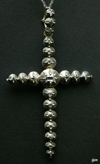 | ステップカット・ダイヤモンドは、アールデコから増えるのですが、実はダイヤモンドの最も初期のカットでもあるのです。 アールデコのモダンなデザインに輝くステップカット・ダイヤモンドも魅力的ですが、このクロスの古のシルバークロスに輝くステップカットは心揺さぶられるものがありますね。 |