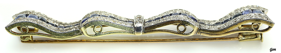 このリボン・ブローチは、まるで布のリボンのようなうねりをプラチナと金を貼り合わせた板を曲げることで表現していますが、これほど独創的なデザインは滅多にある物ではありません!! そして美しいうねりを引き立たせるために、当時の最先端の石留めの技術であるカリブレカットの技法を駆使しているのです!! サファイヤはカリブレカットて留められていますが、この留め方は石を留めるのに爪を使うのではなく、レール状のラインに石を置いて両側の縁を僅かに伏せて留めるのです。 石と石の間に爪が見えないので、サファイヤの美しいブルーラインが際立ちますし、うねりも強調されることで、より立体感を感じるのです!! サファイヤはグラデーションになっていますが、ブルーのラインが隙間無く見えるようにするには、一つづつ形や大きさの違う台形にカットしなければなりませんし、これだけうねりのある立体的な構造なので、縁を伏せて石を留める作業は、非常に高度な技術を要します!! だからこのような独創的なデザインのジュエリーは、僕もこの38年間で初めて見る 極めて珍しい物なのです!! 横が8cmと長さがありますが、細長いスタイリッシュなデザインなので、大きすぎて使いにくいことはありません。 むしろとても使いやすく、付けた時にはとても見栄えのするブローチです!♪ アンティークジュエリーのことは全く分からない人でも、センスの良い人ならきっと何と個性的なデザインの美しいブローチなんだろうと思うに違いありません! |
