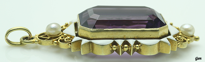 | アメジスト&ホワイトエナメル ペンダント オーストリア 1880年頃 アメジスト、天然真珠、14ctゴールド 45mm×17mm(バチカンを含む) 重量7,3g Sold 仮予約はメールかフリーコール0120-974-384 でどうぞ。 アンティークジュエリーでは当然ながら非加熱の美しいアメジストを使ったペンダント。 少し盛り上がったホワイトエナメルのフレームはスタイリッシュなグッドデザインです!♪ コンディションもパーフェクト! |