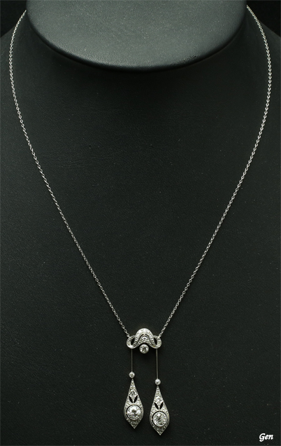 【デザインの特徴】 このネグリジェネックレスはフランスの物のようにエレガントな美しさだけではない個性美を感じます。 ペンダント上部はアールデコのイメージがある斬新なもので、そこから下がる二本のラインはまるで細い線にしか見えません。 通常はこの細いラインの中央にダイヤをセットしてあるものですが、ダイヤをセットしないでナイフエッジ特有の線にしか見えないシャープなイメージにしているのです。 ネグリジェネックレスは、左右で長さの違うラインの先端にダイヤモンドを留めているのが定番ですが、これは左右のライン全体の長さは標準的であっても、下半分には透かしを入れた雫型のプレートにしてそこに大きなダイヤモンドを付けてあります。 アールデコ的な上部のポイントの下に、極端に細く見えるナイフエッジのシャープなラインがあり、その下に美しいダイヤモンドのピアスのような、雫型のパーツ、この一見アンバランスのように見えて個性的で美しいデザインは、やはりオーストリアのジュエリーならではの特徴なのです!! そして細く美しいナイフエッジが生きるのは、細くて美しいセミハンドメイドのプラチナチェーンがあればこそなのです! このネックレスは絶対に実物のが美しいです! 画像では到底その美しさをお伝えすることは不可能です。 ぜひ、実物を手に取ってご覧になって頂きたいと思っております。 |