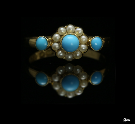 | ターコイズ&パール クラスター リング イギリス 1908年(ホールマーク付き) トルコ石、天然真珠、18ctゴールド ベゼル8mm×15mm 重量 2,4g サイズ 11号(変更可能) Sold 100年経っても退色していない、とても上質のトルコ石と小さくても綺麗な天然真珠を使った可愛い指輪です!♪ でも可愛いだけではありませんよ。 18金を使っているのは良い物として作られた証なのですから・・。 コンディションも抜群に良いですし、ホールマークもばっちりなのも良いですね〜♪ アンティークジュエリーでも安物の指輪などでは、トルコ石が紫外線でグリーンに退色しているものが多いのです。 |
