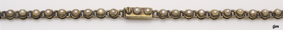| こんな手間の掛かる細工は天然真珠が貴重な物だった証です! プラチナではこのような真珠の留め方は出来ないし、プラチナの圧倒的な人気が出ることで、こういうウェディングネックレスは姿を消していったのです。 |