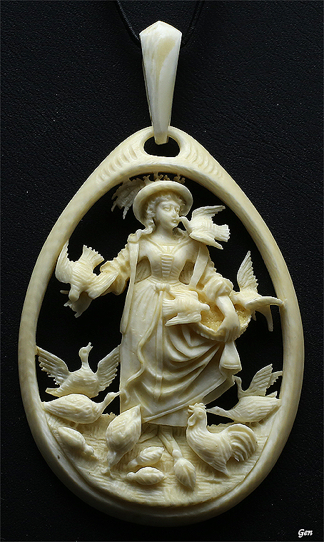 これは大変珍しい構図のカーブドアイボリーです。 鳩と戯れる女性の足下には鶏やいろいろな鳥が彫られていますが、飼っている鳥に餌を与えている女性に鳩が餌をおねだりしている微笑ましいモチーフです。 このような透かしを取り入れたカーブドアイボリーは、ストーンカメオで不可能な繊細な彫りが魅力です。 だから僕はストーンカメオの代用品として作られたアイボリーのカメオよりずっと高く評価出来る物だと思っています。 女性の顔や服の彫りも巧みな彫りですし、コンデイションも抜群です。 デリケートな彫りなので、使わない時は額装して部屋に飾って楽しみの良いでしょうね。