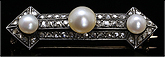 イギリスではボタンパールと言われている何とも面白い形の天然真珠で、僕はこの真珠を大福真珠と命名しようかな(笑)。 この天然真珠は形が珍しいだけでなく、色と照りが素晴らしいです!♪ 150年〜160年は経っていても、これだけ美しい照りは、さすが最上質の天然真珠と言えますね! このブローチはとても珍しく貴重な天然真珠を手に入れた人が特別オーダーして作らせた一点物に違いありません!♪ アールデコのイメージも感じるシンプルなデザインで、大福型という特徴のある天然真珠に相応しいデザインのフレームです! 三列のダイヤモンドの中央の列はローズカットではなく、クッションシェイプですし、全体的にとてもしっかりした見事な作りです! このボタンパールのブローチは天然真珠がお好きな方にとっては垂涎の的ってとこでしょうね♪ |