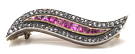 | カリブレカット・ルビーが左右の端にとても鋭角な三角形にカットして留められて居るのにご注目!! カリブレカットは、爪留めではなくレール状の部分にカットされた石を置き、縁を倒して留める石留めの手法です。石と石の間に爪が見えないので、連続するルビーのラインが美しいのです! 特にこのようにカーブしているうえに捻りのある形のカリブレカットは前代未聞です!! |