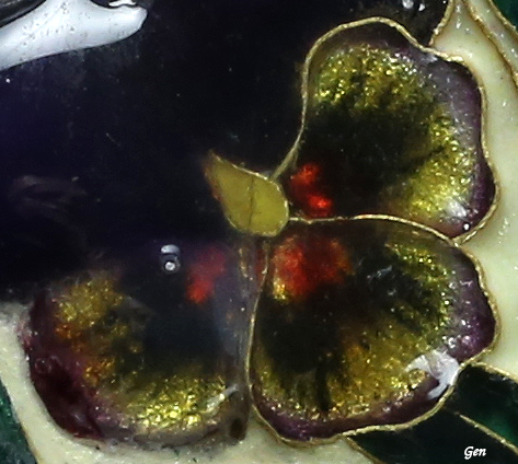 パンジーの花の部分は金色に輝く実に美しいグラデーションで、あの有名なファリーズのエナメルを超える魅力があると思います!♪ このような複雑な色合いでしかも透明感のあるエナメルは、何層ものものエナメルになっているに違いないのです!! ということは、何度も炉に入れて釉薬を焼き付ける訳ですから、 釉薬によって温度を微妙に変えたり、焼く時間を調節する必要があり、相当な高度な技術と手間を要する作業です。 |
