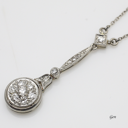 このネックレスは一番下の円形に小さなダイヤモンドをまるで一つの石のように見える、素晴らしい留め方をしています!!(拡大画像ではそう見えませんが、実物はそのように感じます) こういう目立たない部分に気を遣っているのが良い物の証なのです! それにこのネックレスは全体の作りがとても丁寧で、完成度の高さはこのタイプの中でも秀でています! オールドヨーロピアンカット・ダイヤモンドも上質の石が使われていますし、石留めも非常に優れてい |