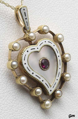 ウイッチーズハート ペンダント イギリス 1890年頃 ルビー、天然真珠、マザーオブパール、エナメル、18ctゴールド 2,7cm×1,8cm Sold ウイッチーズハート(魔女のハート)は、当時とても人気のあったデザインです。 シードパールのウィッチーズハートの内側に、ホワイトエナメルと優美な輝きのマザーオブパールのウィッチーズハート、そして中央に綺麗なルビーをセットした素敵なプチペンダントです!♪ ベルベットのリボンに下げたら可愛いでしょうね♪ チェーンを希望される方には、現代の9ctゴールドのチェーンをお付けします。