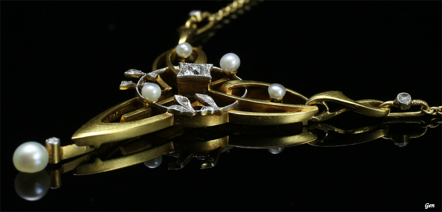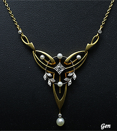 セセッション(ウィーン分離派) ネックレス オーストリア 1905年〜1910年頃 天然真珠、オールドヨーロピアンカット・ダイヤモンド、 ローズカットダイヤモンド、プラチナ、14ctゴールド 5cm×4,5cm 14ctゴールド セミハンドメイド・チェーン 45cm 14ctゴールドボックス型クラスプ付き 重量8,8g Sold フランスで言えばアールヌーボーに属するデザインですが、ヌーボーよりも進化したデコの要素が見られる、すっきりした美しいデザインです。 セセッション(ウィーン分離派)のジュエリーは、フレンチヌーボーに比べればずっと少ない珍しいジュエリーですが、一般的には余り知られていないので、お買い得な価格なのです。 セセッション(ウィーン分離派)は、ドイツ語圏内におけるアールヌーボーと言える芸術運動のユーゲントシュティール(Jugendstil )に属します。 |