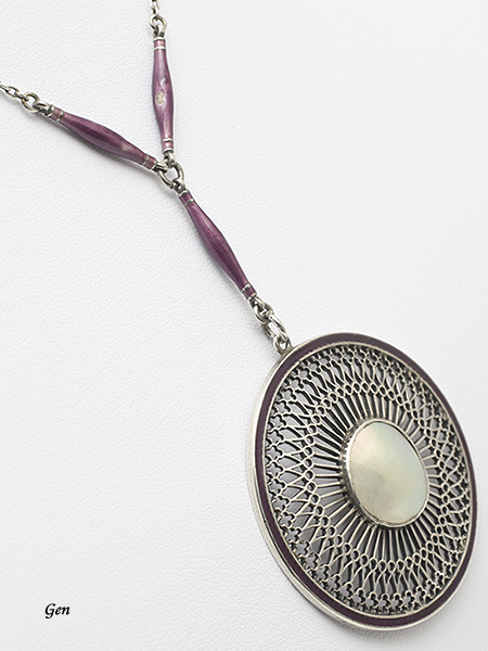 | パープルエナメル オープンワーク ペンダント イギリス 1920年頃 シェル、シルバー、ギロッシュエナメル セミハンドメイド・チェーン42cm 直径4cm 重量11.3g ¥138,000- この透かしは繊細で実に美しい透かしですし、エナメルの色が美しい!♪ ペンダントを下げているY字型のパーツには地模様が僅かに透けて見えるギロッシュエナメルが施されています。 エナメルは若干のダメージがありますが、この価格からすれば充分に許せる範囲のことです。 |