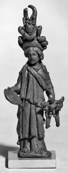 イシス・フォルチュナ小像 古代ローマ 1世紀〜2世紀 ブロンズ像 高さ10,6cm Walter 美術館 彼女は、角もしくは羽の間に月の円盤があるイシスの凝った頭飾りを身につけ、彼女の長いドレスの前部には、いわゆるイシスの結び目と言われる結び目で胸で締めてあります。 |