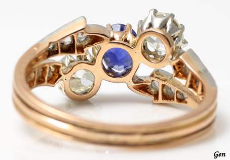 | サファイア&ダイヤモンド リング ヨーロッパ 1893年〜 フランスのインポートマークのフクロウ(1893年〜1984年)が付いているので、フランス以外のヨーロッパで1893年〜1905年ぐらいに作れた指輪だと思われます。 サファイア、オールドヨーロピアンカット・ダイヤモンド、 ローズカットダイヤモンド、18ctゴールド&シルバー Sold このサファイアは、まるでカシミールサファイアのような濃い美しいブルーです!♪ 上質のオールドヨーロピアンカット・ダイヤモンドを左右の斜めに配し、二本の腕に分かれたグッドデザインのシャンクは、この美しいサファイアに相応しい作りです!♪ 全体に普通よりも厚みのあるとてもしっかりした良い作りです。 この価格帯でこれだけ美しいサファイアの指輪は滅多に無いと思います! |