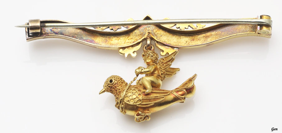 | エンジェルの頭部はたった3mmぐらいしかないとても小さな物なのに、そこに極小の粒金をびっしりと鑞付けしてあるのには驚きます!!! まるで紀元前の古代エトルリアの粒金細工のようです!! エンジェルの羽と鳥には、極めて細い金線を使った縒り線の装飾がなされていますが、これも実物をルーペで見ないと気がつかないような、繊細至極の金細工です!! しかもエンジェルと鳥は完全に立体的な形で、全面に粒金と縒り線細工をしてあるのでからね〜!!! この価格帯でこれだけの金細工の物は、滅多にある物ではありません!! |