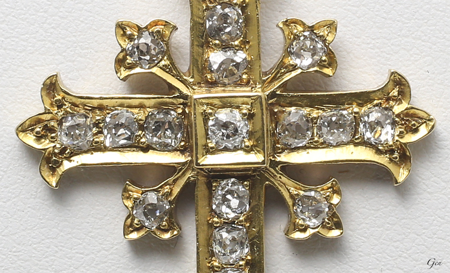 重量が7,9gもあり、ずしりと心地良い亜重さを感じるのはハイクラスのジュエリーの証です! 充分な厚みのあるフレームに溝を掘ってダイヤモンドをびっしり留めてありますが、クッションシェイプのダイヤモンドは厚みのあるとても上質な石で、その豪快な輝きは現代のブリリアンカットのダイヤとは一線を画すものです!♪ 19世紀のダイヤモンド・ジュエリーの多くはシルバーにゴールドバックですが、このクロスはゴールドだけで出来ているのが特徴です。 見事な金細工のクロスとアンティークならではのクッションシェイプダイヤモンドのダイナミックな輝きは、きっと貴方を魅了するでしょう♪ 《現代のダイヤモンドに比べてアンティークの上質のダイヤモンドがずっと美しいのは何故か?》もご覧ください。 |