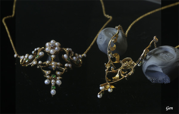 ヴィクトリア時代中期のジュエリーに比べて洗練されたエレガントなデザインが特徴で、シードパールのコンディションも良いので、天然真珠ならではの美しい照りがあります! ウラル山脈からはもう産出されていないので、良い石はアンティークジュエリーでしか見ることはないのです。 |