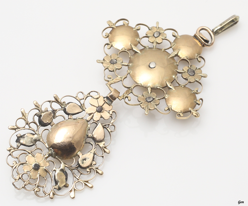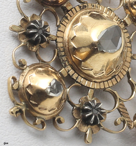 | とても高さのある独特の形の金の台座に、ローズカットダイヤモンドとステップカットのダイヤモンド留めてあるのが、18世紀初期から中期のフランドル地方のダイヤモンド・ジュエリーの特徴です。 |