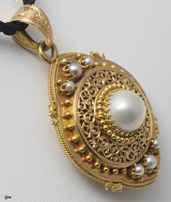 このロケットペンダントに使われている天然真珠は、すべてハーフパールでグレーがかった珠で揃っています。 バチカンの彫金や多数の粒金それに縒り線は、19世紀中期のゴールドジュエリーならではの魅力です。 |
